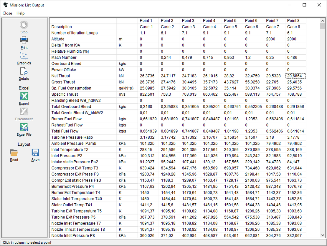 GasTurb can simulate a complete flight mission in one go. It can also be run in batch mode with an unlimited number of points, in which case the output will be written to an excel sheet.